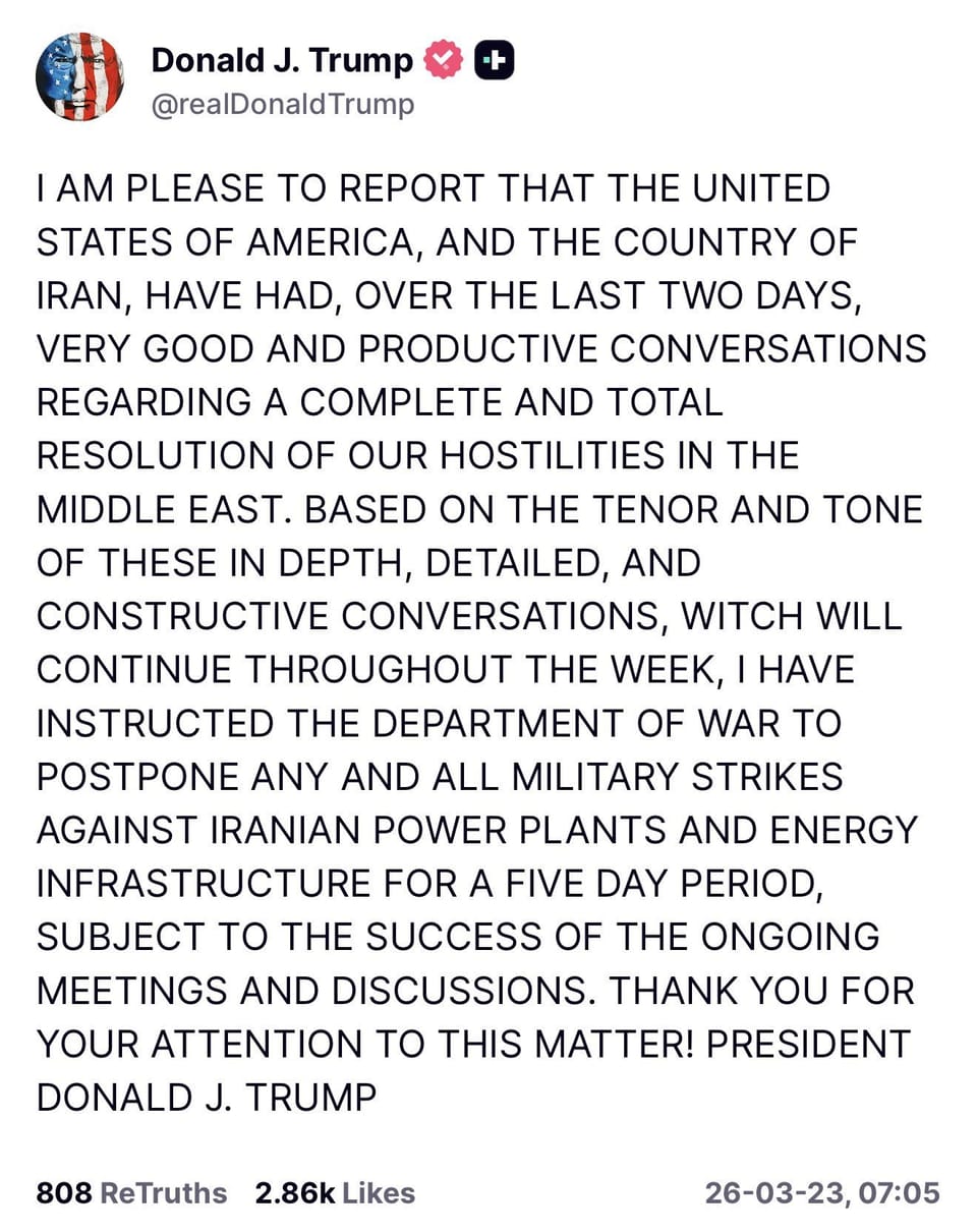 财经 特朗普暂缓打击伊朗电厂:五天窗口期的三种走向 特朗普宣布暂停打击伊朗电厂五天,从48小时最后通牒到暂缓的转变暗示什么?布伦特原油暴跌14%,道指期货跳涨1100点。三种推演 ✦ 锐报编辑部 · 2026年3月23日 20:33 · 10 min read #财经 SHARE ✦ 锐报编辑部 独立观察,锐利发声。从地缘到市场,穿透每一层因果。